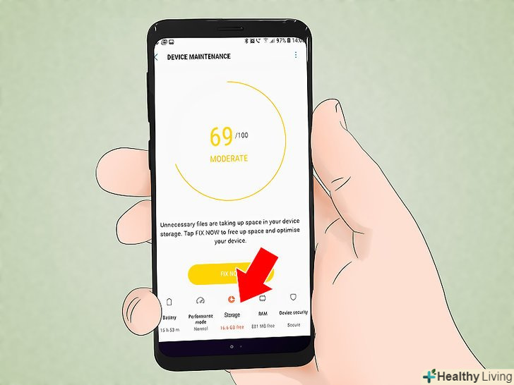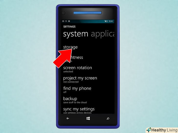 Прокрутіть сторінку та знайдіть опцію "Пам'ять телефону".запустивши програму "Налаштування«, прокрутіть сторінку вниз і знайдіть опцію» Пам'ять телефону «(вона розташована між опціями» Економія заряду «і»резервне копіювання").- Вибравши опцію "Пам'ять телефону", на екрані відобразиться інформація про вільний простір в пам'яті пристрою і на SD-карті.
