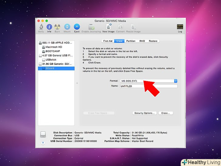 Задайте формат файлової системи. Це можна зробити у випадаючому списку.[9]- Виберіть одну з наступних файлових систем: Mac OS Extended( Journaled), Mac OS Extended (Case-Sensitive, Journaled), MS-DOS (FAT), exFAT. Вибравши MS-DOS (FAT), ви відформатуєте карту в файловій системі FAT32.[10] вибравши exFAT, карта буде відформатована у файловій системі exFAT, що дозволить зберігати на ній файли, розмір яких перевищує 4 ГБ.