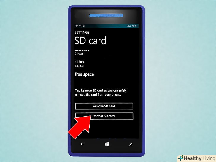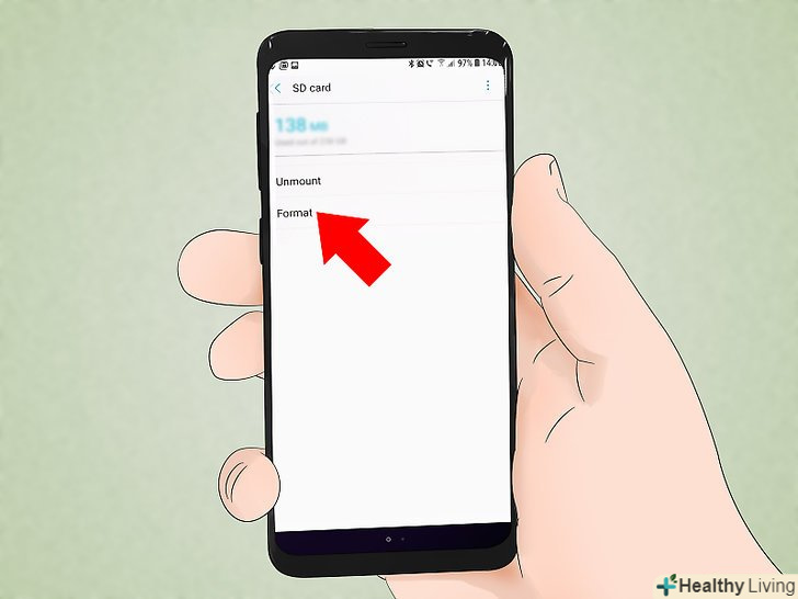 Позначте опцію "стерти SD-карту" або»відформатувати SD-карту".на екрані відобразиться сумарна ємність SD-карти, величина вільного простору і кнопки» Від'єднати SD-карту «і»відформатувати SD-карту".[1]- Якщо кнопка» відформатувати SD-карту "недоступна, то для початку від'єднайте карту, для цього натисніть на»Від'єднати SD-карту".