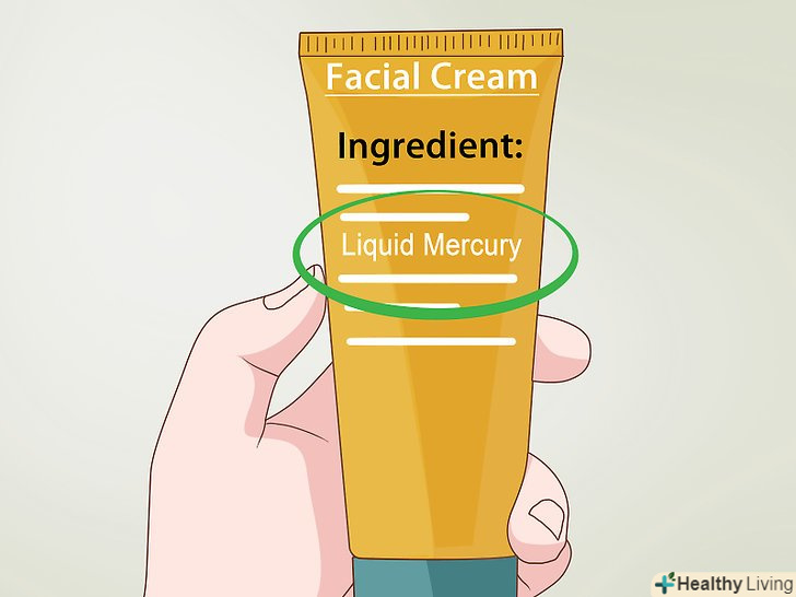Перевірте, чи немає ртуті в фармацевтичних засобах. деякі фармацевтичні продукти можуть містять ртуть. Ртуть може входити до складу антисептичних засобів для шкіри, кремів для обличчя, розчинів для контактних лінз і деяких вакцин. Щоб перевірити, чи немає у відповідних засобах ртуті, перевірте їх склад або зв'яжіться з виробником. [9]