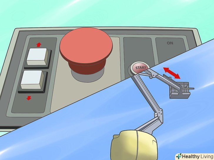 Переключіть джойстик, щоб підняти стрілу вгору. починайте потихеньку, треба час, щоб звикнути до ходу стріли. Якщо ваш підйомник оснащений ручкою регулювання управління швидкістю , виберіть маленьку швидкість, щоб звикнути до управління машиною. Більшість стріл підйомників піднімаються в повітря натисканням лівого перемикача або поштовхом ручки управління вперед. Швидкість стріли пропорційна силі, що додається при натисканні. У нових моделях підйомників в джойстики (управління стрілою і привід/кермо) вбудовують захисні пристрої, тому щоб запустити двигун потрібно підняти кільце під набалдашником джойстика. Цей механізм не дає платформі несподівано пересунутися, якщо хтось зачепив ручку управління.