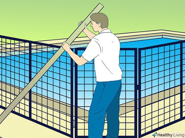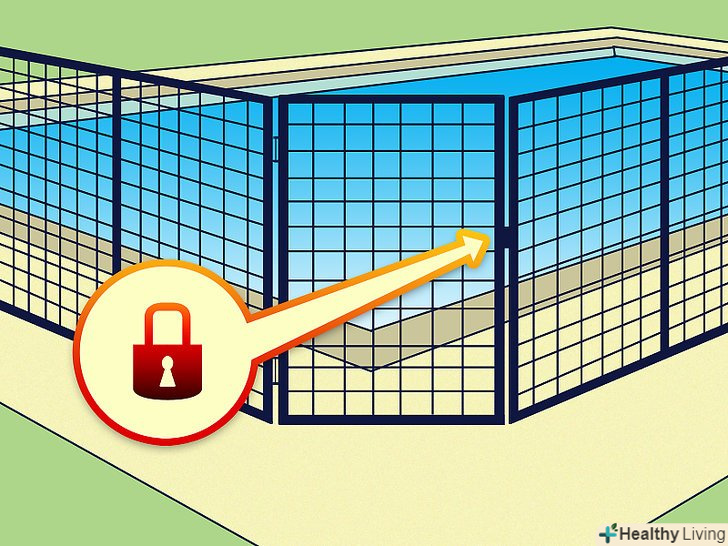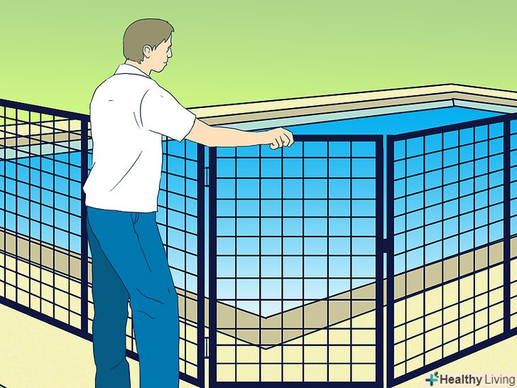 Встановіть навколо басейну паркан. подекуди наявність паркану навколо басейну є обов'язковою умовою. Якщо муніципальна влада вашої місцевості ще встановили Нормативи огорож басейнів, то слід встановити огорожу висотою як мінімум в півтора метра. Дверцята повинна мати захист від дітей, яку можуть відкрити тільки дорослі, також не повинно бути ніяких лазівок і щілин, через які можна було б проникнути всередину.