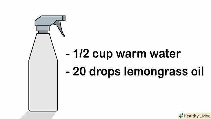 Використовуйте засіб на основі лемонграсу від плодових мушок і кімнатних мух. додайте ½ склянки гарячої води і 20 крапель ефірного масла лемонграсу в аерозольну ємність і струсіть.- Засіб не знищує, але відганяє мух. Розпилюйте розчин на підвіконня, дверні прорізи та інші проблемні ділянки в кухні. [16]