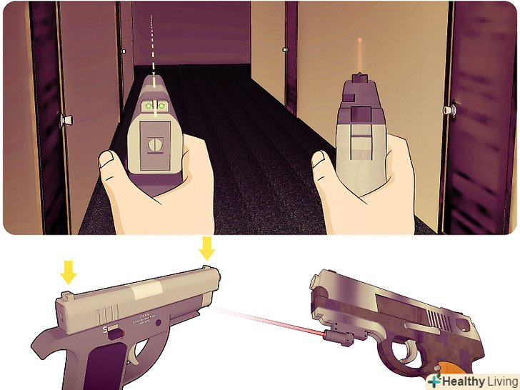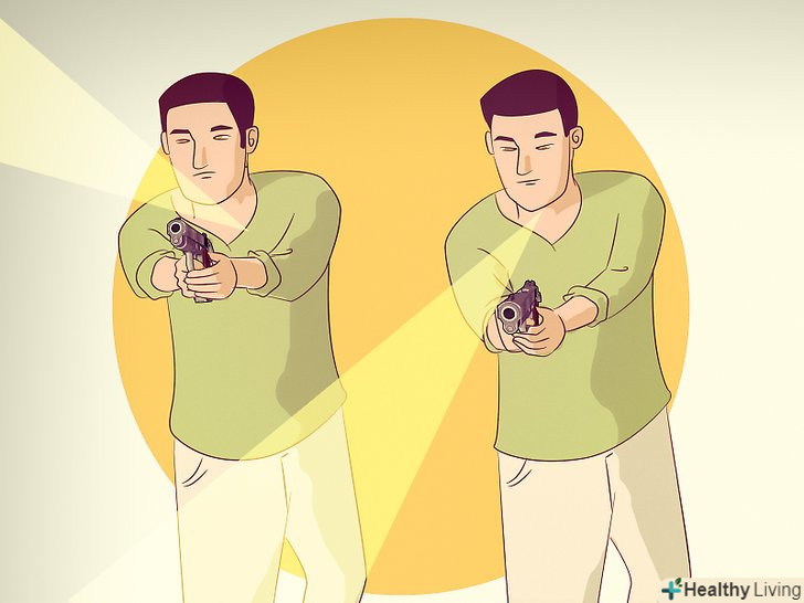 Завжди цільтеся туди, куди дивляться ваші очі. це дозволить вам швидко зреагувати в разі небезпеки. Руки тримайте витягнутими або будьте готові швидко витягнути їх (в цьому випадку руки зі зброєю притиснуті до грудей, а лікті злегка підняті). [2]