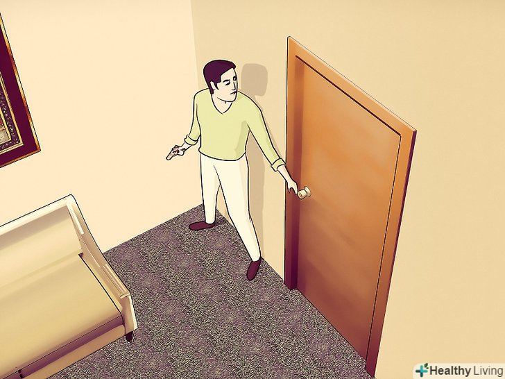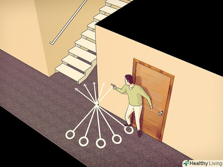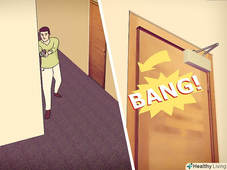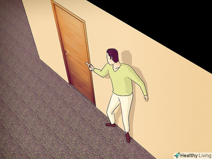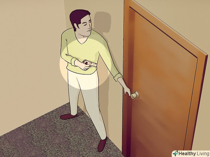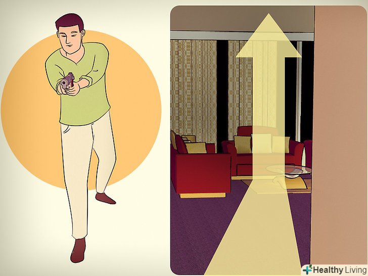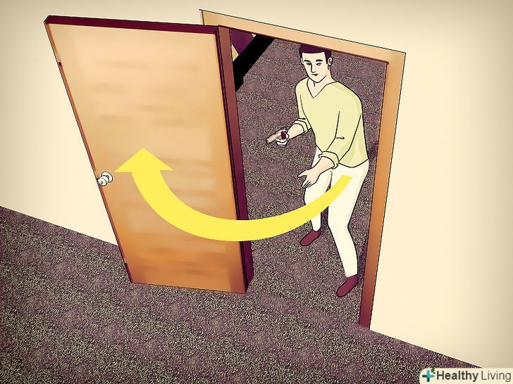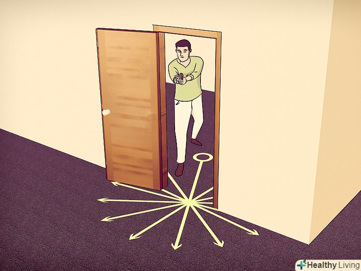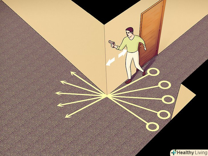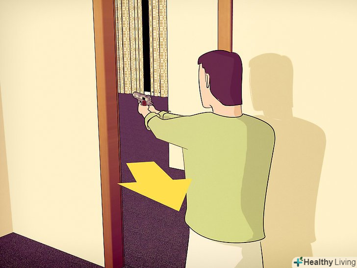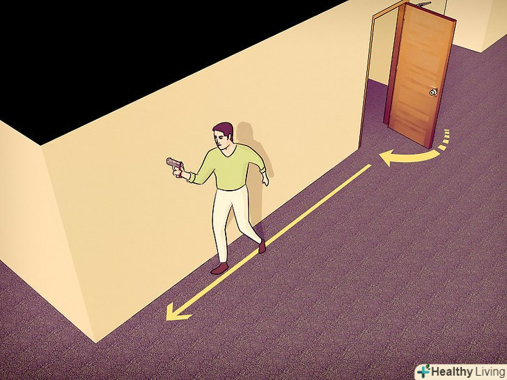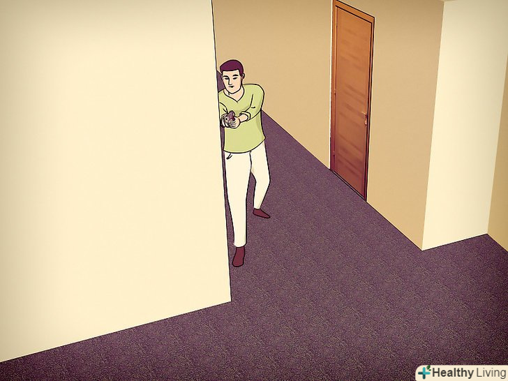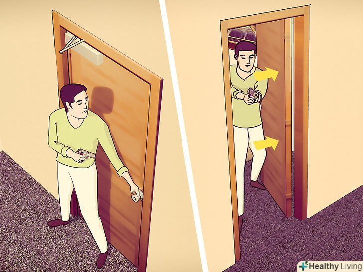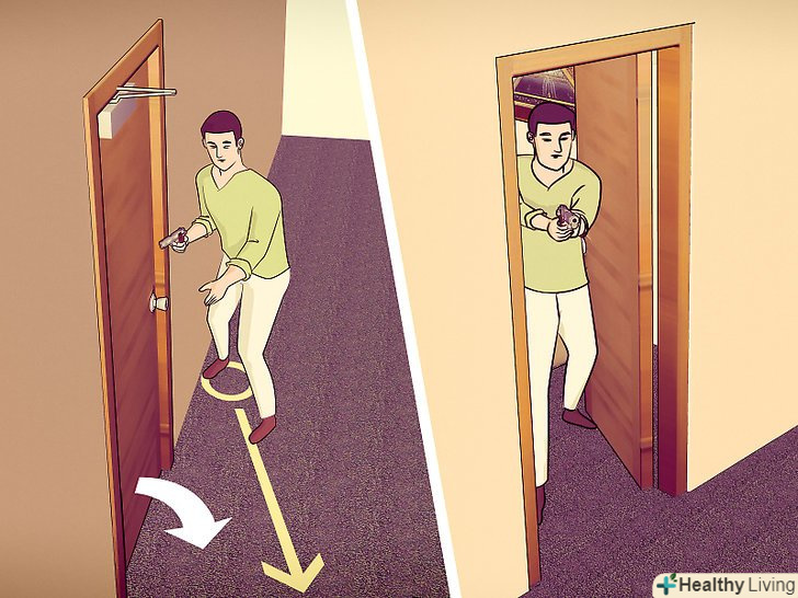 Якщо двері відкриваються назовні, а ви стоїте з протилежного боку від петель, з силою штовхніть двері, щоб вона відкрилася якомога ширше. у цей момент пробіжіть на іншу сторону від дверей і затримайте її плечем або ногою.- Пробігаючи повз відкриті двері, Ви отримуєте можливість швидко оглянути кімнату.