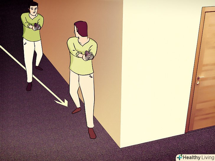 Просуваючись до кута, розташованого по діагоналі, подивіться через плече на кут, який залишився у вас за спиною, щоб переконатися, що в ньому нікого немає (ви могли не помітити злочинця в кутку кімнати при зачистці дверного отвору).- Спочатку огляньте кут, до якого ви йдете, і тільки потім подивіться на кут, який залишився у вас за спиною.