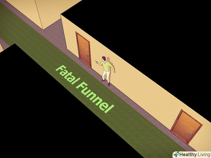 При зачистці будівель дверні прорізи є одними з найнебезпечніших об'єктів. сюди включаються будь-які проходи з / в приміщення (наприклад, вузькі коридори і арки). При виборі місця для засідки дверний отвір буде ідеальним рішенням. Зачищайте дверні прорізи якомога швидше.- Небезпечна область дверного отвору включає простір по обидві сторони від нього і перед ним (Рівне висоті і ширині отвору). [3] таким чином, стоячи біля дверного отвору, ви перебуваєте в зоні ураження (злочинець може вас побачити і вистрілить в вас).
