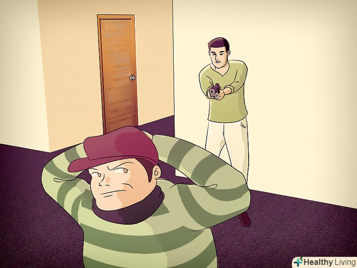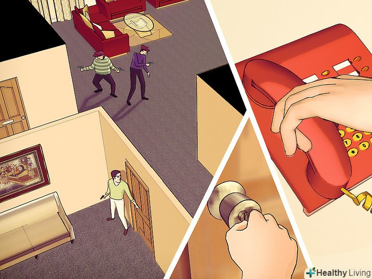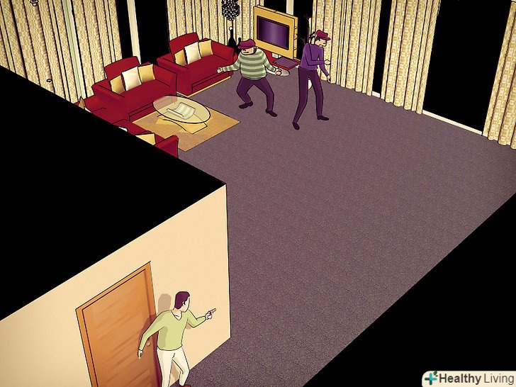 Розробіть план дій. Якщо ваші рідні знаходяться в одній кімнаті з вами, або якщо ви один у всьому будинку, то це спрощує завдання. Якщо ви впевнені, що в будинку злочинець, зателефонуйте в поліцію. Закрийтеся в кімнаті і чекайте приїзду поліції. Не наближайтеся до поліцейських з вогнепальною зброєю в руках-покладіть його в кобуру або на землю, як тільки поліцейські наблизяться до вас.- Чекайте в кімнаті і не зачищайте будинок, так як це дуже небезпечно і можна нарватися на кулю або ніж. Крім того, страховка повинна покрити будь-які вкрадені або пошкоджені предмети.