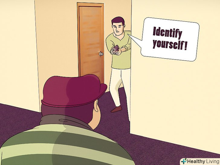 Попередьте злочинця про те, що ви озброєні. цього не треба робити, якщо він першим відкрив вогонь.- Врахуйте, що в будинку може бути кілька злочинців. Постарайтеся перебувати в укритті так довго, як можливо.