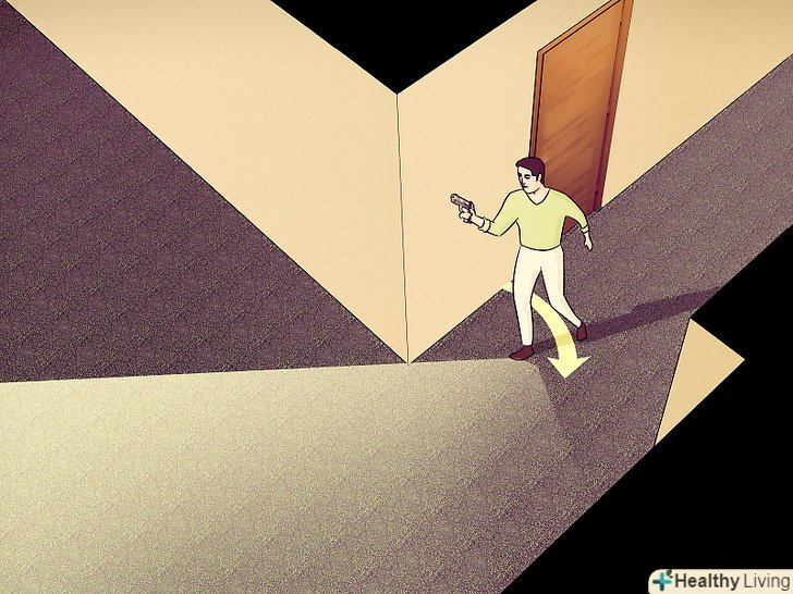 Перед кожним кроком оглядайте видиме вам простір, починаючи з підлоги і закінчуючи стелею (вертикально вгору).- Міцно тримайте зброю двома руками. Злегка нахиліться вперед, щоб ваша голова (і очі) була трохи попереду – це дозволить вам побачити злочинця перш, ніж він бачить вас.