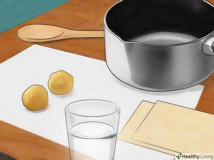 Візьміть 2 кульки неочищеного пальмового цукру, посудину, що містить 200 мл води, шматок картону і дерев'яну ложку.