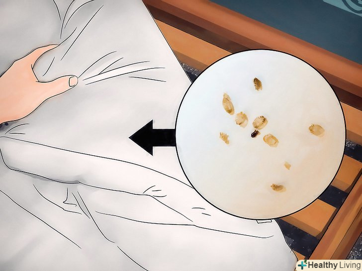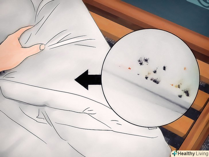 Пошукайте на простирадлах і матраці сліди крові і фекалій комах. клопи харчуються протягом 3-10 хвилин на добу. При цьому на ліжку залишаються плями крові від ранок (комахи вводять в місце укусу речовина, яка не дає крові згорнутися) або більші плями від переїв і лопнули клопів. Їх фекалії виглядають як дрібні чорні плями розміром з точку від маркера. Це пояснюється тим, що клопи харчуються кров'ю, і висохла кров входить до складу їх виділень. [2]- Часто клопи випорожнюються там же, де їли. Це нерідко (але не завжди) трапляється на краях матраца, складках простирадлом, подушок і наволочок.