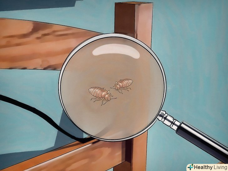 Перевірте узголів'я ліжка і пружинний матрац. хоча ці місця і не є основними ділянками, на яких годуються клопи, вони служать комахою для життя і відтворення потомства. Ретельно огляньте щілини і поглиблення — саме тут люблять розмножуватися клопи. [4]- Зніміть чохол з пружинного матраца. Огляньте щілини і стики в дерев'яному корпусі ліжка. Використовуйте при цьому збільшувальне скло і ліхтарик. Подивіться, чи немає чорних плям (живих клопів) або білих личинок.
