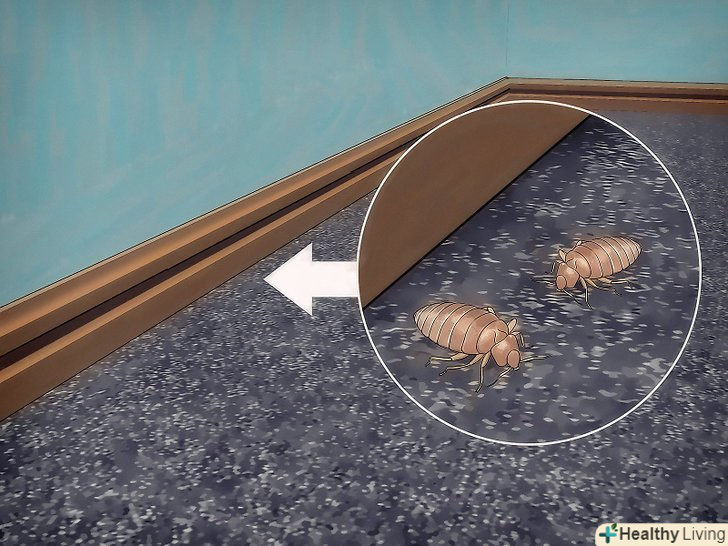 Перевірте краї підлогового покриття. клопи люблять ховатися в різних видах килимового покриття (фіксованого або вільного) або лінолеуму. Крім того, ці місця прекрасно підходять для розмноження комах. Якщо є можливість зробити це і не пошкодити килимове покриття або лінолеум, відігніть його краю. За допомогою збільшувального скла і ліхтарика перевірте, чи немає слідів клопів, їх панцирів або фекалій. Огляньте також місця стику дощок або паркету.