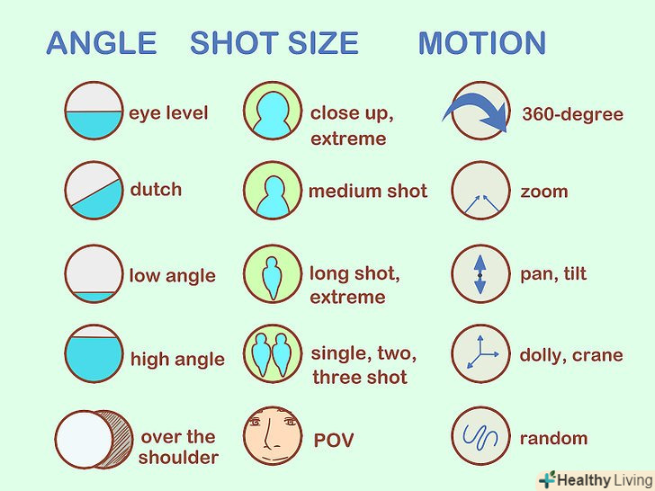 Знайте, які є типи кадрування і під яким кутом можна знімати. Вам як режисерові потрібно знати, як може рухатися камера і що може бути в кадрі, щоб розуміти, як краще зняти кожну сцену і що ці сцени повинні давати фільму. Різні кути зйомки і типи кадрування впливають на сприйняття матеріалу.[5]- Відстань від предмета зйомки до камери може бути різним: дуже велика відстань( як правило, близько 500 метрів), велика відстань (природне відстань, яке приблизно дорівнює відстані від глядачів до екрану в кінотеатрі; в кадрі показують героїв і задній план), середня відстань (використовується для сцен діалогів або великих зйомок будь-якої дії; зазвичай в кадр потрапляють 2-3 героя по груди), маленька відстань (в кадрі особа або предмет, фон розмитий; використовується для передачі думок героя), дуже маленька відстань (показана маленька деталь - наприклад, очі або рот; використовується для досягнення якогось яскравого ефекту).