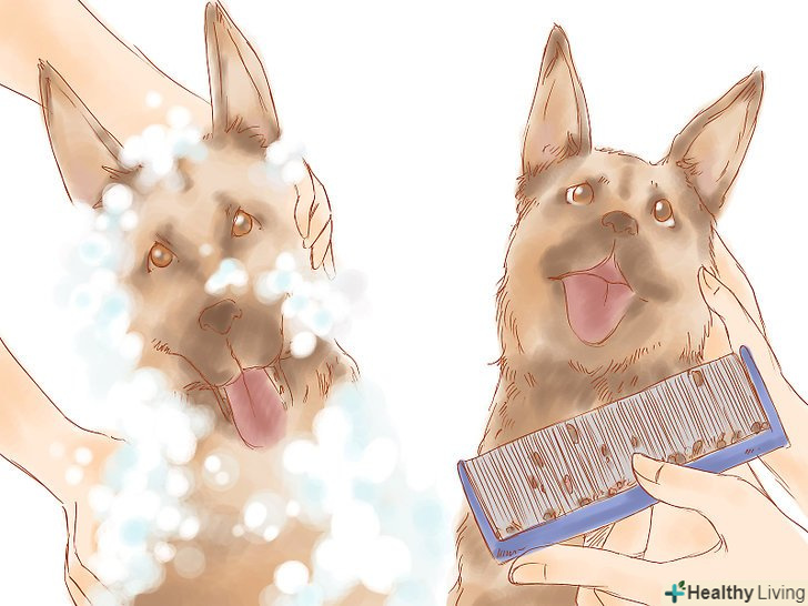 Натріть шерсть миломІ зачекайте принаймні 10 хвилин. після того як ви завдасте мило на проблемні місця, намочіть шерсть і намильте все тіло тварини. Через 10 хвилин ретельно змийте мило теплою водою. [12] коли шерсть висохне, за допомогою гребінця видаліть з неї загиблих комах.- Відразу після купання домашнього вихованця прийміть душ, оскільки деякі шампуні від бліх при тривалому впливі можуть викликати роздратування шкіри у людини.