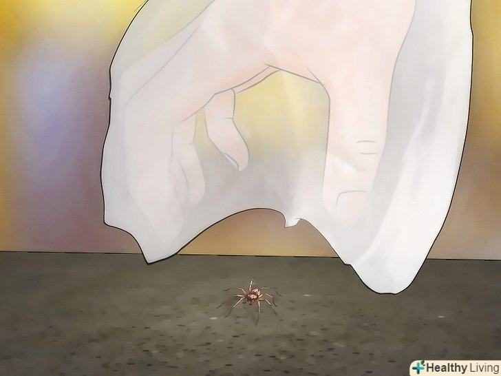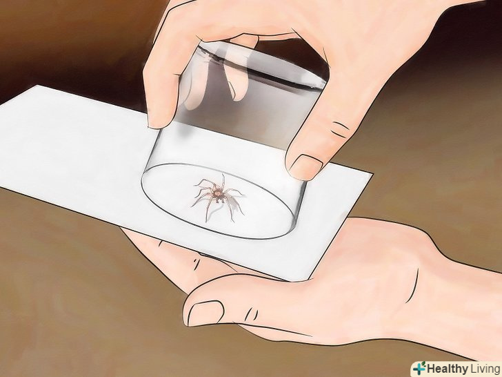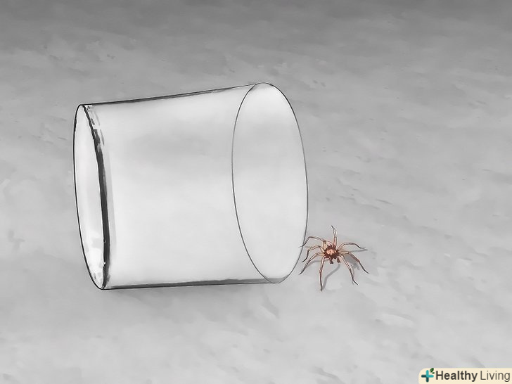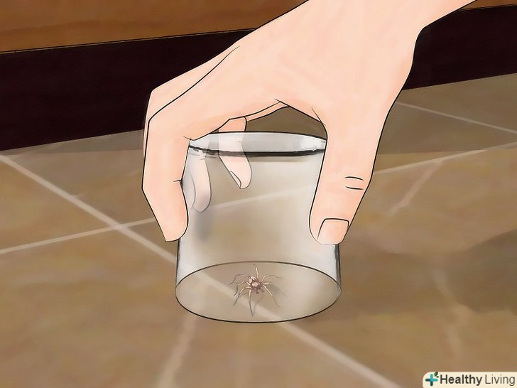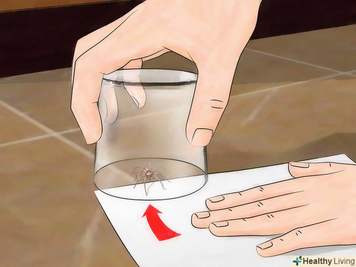 Накрийте павука склянкою. даний метод найкраще підходить в тому випадку, якщо павук знаходиться на підлозі або стіні. Обережно підійдіть до павука, щоб не злякати його. Після цього швидко накрийте павука невеликим склянкою, щоб він опинився всередині нього. [4]- Краще використовувати прозорий стакан — в цьому випадку ви зможете бачити павука всередині нього. Проте, можна взяти будь-який стакан або чашку, які опиняться під рукою.