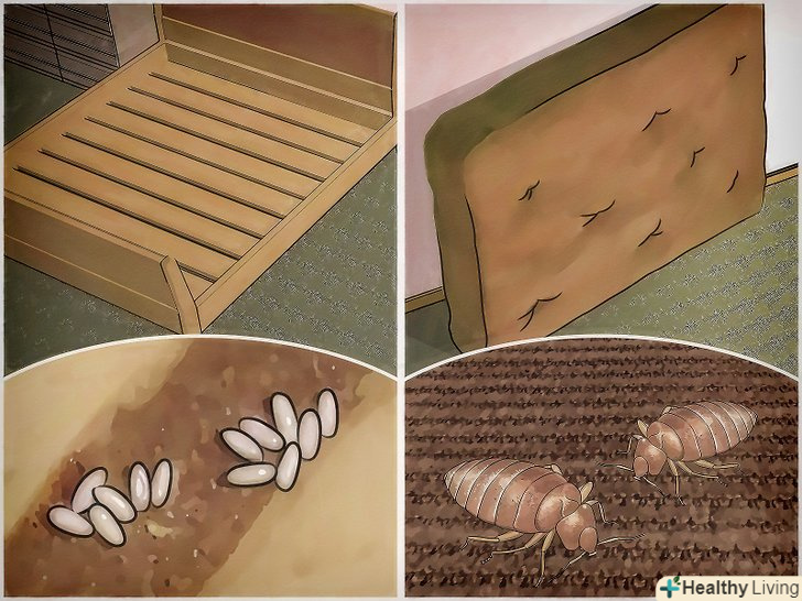 Розберіть ліжко і поставте її частини вертикально, на торці. потрібно шукати безпосередньо самих клопів і світло-коричневі линялі оболонки лялечок. У місцях проживання клопів і швах матраців часто можна виявити темні цятки висохлих екскрементів комах. Нерідко для огляду і можливої дезінсекції доводиться знімати марлеву тканину внизу пружинного блоку матраца. Потрібно оглянути тріщини і щілини опорної рами ліжка, особливо якщо рама зроблена з дерева (дерево і тканина сильніше приваблюють постільних клопів, ніж метал або пластик). [5]- Провести повноцінну дезінсекцію звичайних і пружинних матраців нелегко, можливо, уражені елементи ліжка доведеться утилізувати.