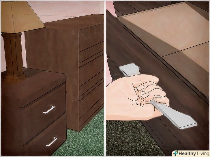 Звільніть тумбочки і комоди. огляньте їх зсередини і зовні, потім переверніть їх для огляду дерев'яних частин знизу. Часто клопи ховаються в тріщинах, кутах і виїмках. [7]