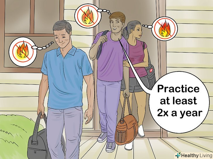 Відпрацьовуйте план евакуації хоча б два рази на рік. на кожному практичному занятті можна уявляти, що пожежа охоплює різні частини будинку, щоб проводити різні навчання і знати, який маршрут мінімізує вплив диму і вогню. Також тренуйтеся будити сплячих членів сім'ї, як якщо б сигналізація спрацювала посеред ночі.- Запишіть і намалюйте план евакуації і надайте копії кожному члену сім'ї.