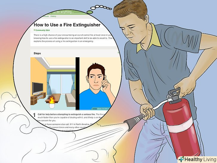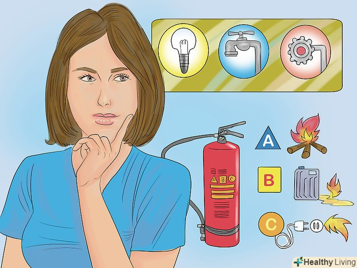 Купіть і навчітьсяКористуватися вогнегасником . вогнегасник повинен знаходитися на кожному поверсі вашого будинку. Щороку перевіряйте стан пристрою. Чим більше вогнегасник, тим краще, але переконайтеся, що зможете управлятися з ним без особливих зусиль. [9] побутові вогнегасники бувають трьох типів: класу A, Класу B і класу C. Також можна купити комбінований варіант на зразок класу B-C або класу A-B-C. вогнегасники можна придбати в будівельному магазині і в Інтернеті. [10]- Вогнегасники класу A призначаються для гасіння звичайних матеріалів на зразок деревини, паперу і тканини;