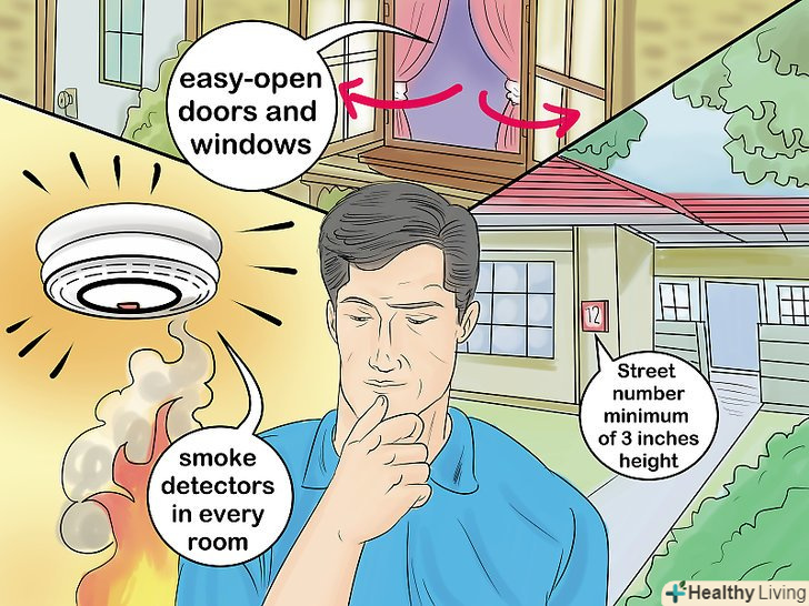Слідкуйте за пожежною безпекою будинку. встановіть пожежну сигналізацію у всіх кімнатах і переконайтеся, що всі двері і вікна легко відкриваються. Також не забудьте про сітки і двері-ширму. Переконайтеся, що номер вашого будинку можна побачити з дороги. Цифри повинні бути яскравого кольору і висотою не менше 8 сантиметрів. Так пожежникам буде простіше знайти ваш будинок і скоріше приїхати. [12]- Також корисно встановити датчики диму в коридорі біля кожної спальні і на сходах.