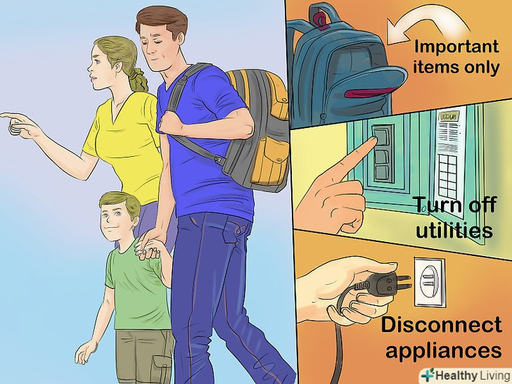 Визначте порядок дій на випадок евакуації. у разі наказу про евакуацію потрібно швидше йти з дому. Повірте, що влада вживає всіх необхідних заходів, а вдома ви не будете в безпеці. Вся сім'я повинна знати порядок дій в разі евакуації при повені. Ось деякі поради: [16]- Беріть з собою тільки найнеобхідніші речі;