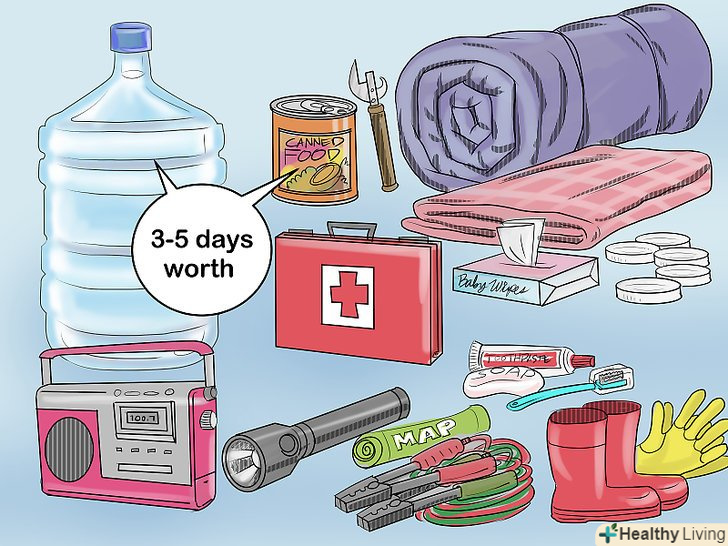 Зберіть аварійний набір. також на випадок надзвичайної ситуації слід підготувати запас непортящихся продуктів і питної води хоча б на три дні. Не забудьте про інші речі, які знадобляться при відсутності комунальних послуг і закритих магазинах. Також складіть маленький набір, який слід зберігати в багажнику автомобіля. Що вам знадобиться: [3]- Медичні карти всіх членів сім'ї;