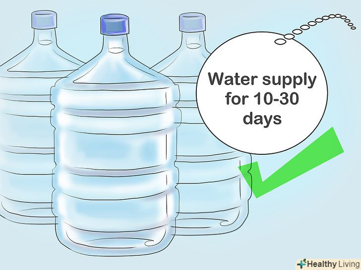 Запасіться водою на 10-30 днів. при надзвичайній ситуації на зразок землетрусу подача води може припинитися, а магазини не працюватимуть. При повені навколо буде багато води, але її не можна пити. Доступ до питної води буде не завжди.- Запасайтеся водою з розрахунку 4 літри на людину в день. Цей обсяг включає воду для пиття, приготування їжі та санітарних цілей. [1]