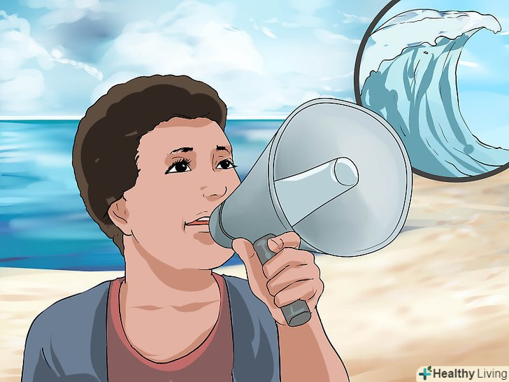 Запам'ятайте ознаки наближення цунамі. незважаючи на те, що вас, швидше за все, попередять про цунамі по телебаченню, радіо або через Інтернет, вам корисно запам'ятати ознаки цунамі. Швидше за все, спочатку ви відчуєте серйозні поштовхи землетрусу, який і викликає великі хвилі. У морі може початися раптовий відлив, тому Берегова лінія відступить, ви побачите пісок, дно, черепашки та іншу морську живність. Коли величезна хвиля починає наближатися, ви почуєте гучний гул, схожий на звук літакового двигуна. [10]- Помітивши будь-який з цих ознак, необхідно евакуюватися якомога швидше, навіть якщо ви не чули ніякого офіційного оголошення про евакуацію.