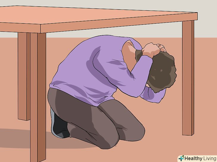 Забезпечте собі захист під час землетрусу. якщо ви живете на узбережжі, то перед цунамі можете відчути підземні поштовхи, які і викликають хвилі. Під час землетрусу дуже легко отримати травму, тому якщо землетрус триває довше 20 секунд, впадіть на підлогу, знайдіть собі укриття під партою або столом і обов'язково міцно тримайтеся за що-небудь. [14]- Як тільки поштовхи припиняться, зберіть сім'ю і якомога швидше евакуюйте. Відчутні поштовхи землетрусу зазвичай говорять про те, що цунамі може прийти протягом декількох найближчих хвилин.