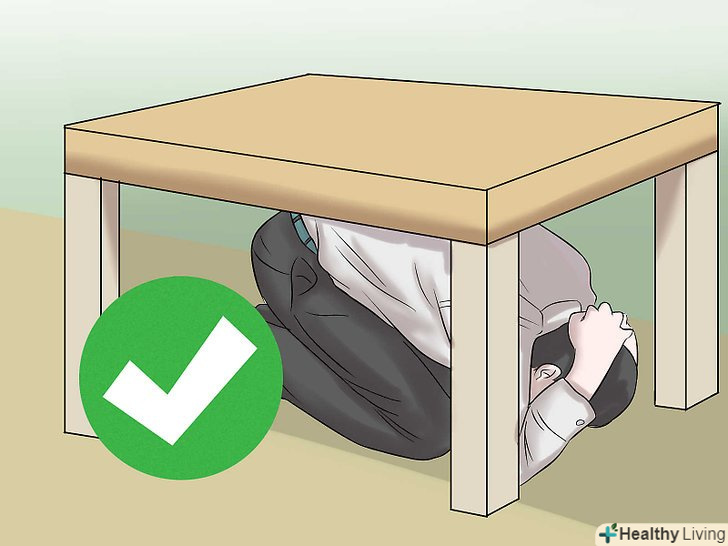 Практика "впади, накрийся і тримайся". всупереч поширеній думці, дверні прорізи зовсім не безпечні під час землетрусу. Опустіться на коліна. Прикрийте руками голову і шию. Заповзіть під міцний стіл і схопитеся за одну з його ніжок. [27]- Щоб зреагувати, у вас буде тільки кілька секунд. Потренуйтеся, і ви зможете виконати все необхідне швидше. [28]