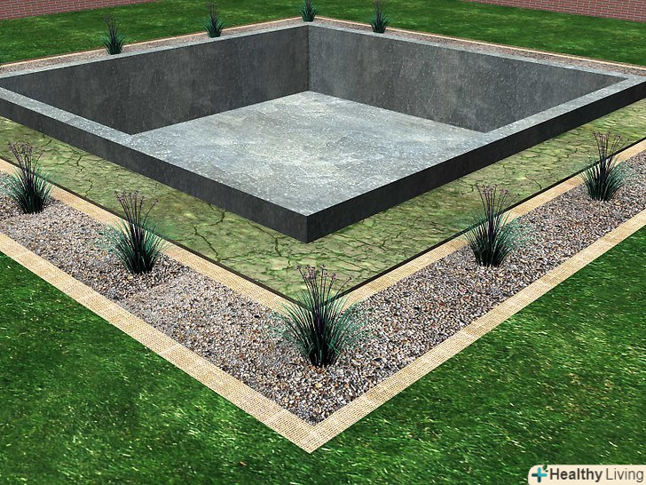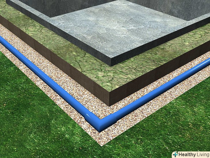 Укладіть щебінь і труби. засипте фільтруючу тканину шаром щебеню товщиною 7-10 см.тепер встановіть 4 дюймову перфоровану трубу по всьому периметру фундаменту. Перфорована труба повинна встановлюватися на рівну поверхню. Використовуйте жорсткий 4 дюймовий трійник ПВХ для з'єднання кінців перфорованої труби. Тепер ви можете підключити жорстку 4 дюймову ПВХ трубу до трійників, направивши її до фільтраційної траншеї, сухого колодязя або на поверхню на денне світло. Засипте трубу щебенем до рівня близько 20-25 см від основи фундаменту. Потім натягніть фільтруючу тканину поверх щебеню так, щоб вона стосувалася фундаменту. Важливо, щоб тканина повністю накривала щебінь, це запобіжить засмічення труби грунтом і піском.
