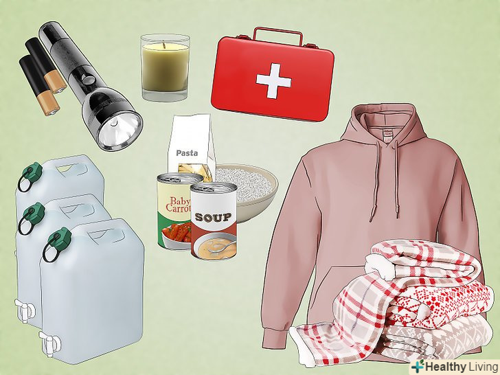 Зробіть запаси необхідного. [4] майте в достатній кількості медичні засоби, їжу, воду, паливо, Туалетний папір, Підгузники та інше. Переконайтеся, що запасів вам вистачить для автономного проживання протягом тижня. Перевірте, чи добре упакована аптечка. Запасіться додатковими простирадлами і ковдрами.- Придбайте достатньо свічок і сірників. Коли будинок буде знеструмлений, вам знадобитися світло. Переконайтеся, що є запасні батареї. Завжди користуйтеся свічками обережно.