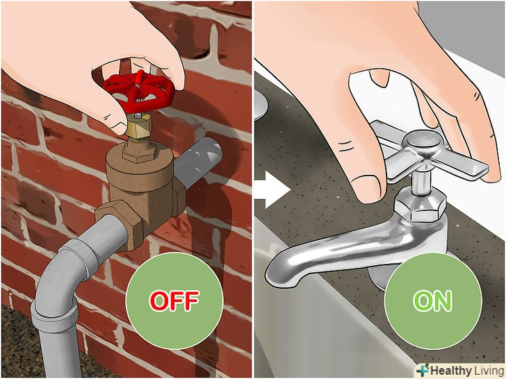 Вимкніть воду на основному вентилі і відкрийте всі крани будинку. цим ви уникнете замерзання води в трубах, і наступних від цього розтрат. [5]