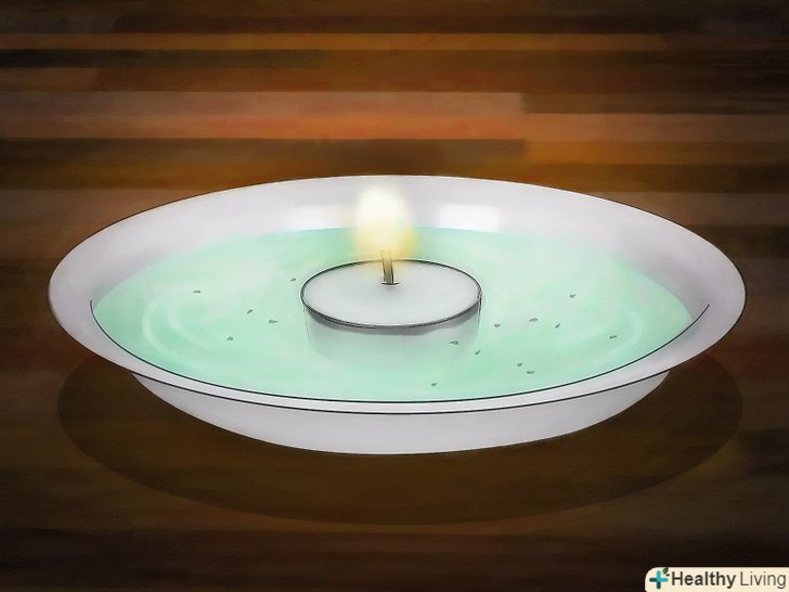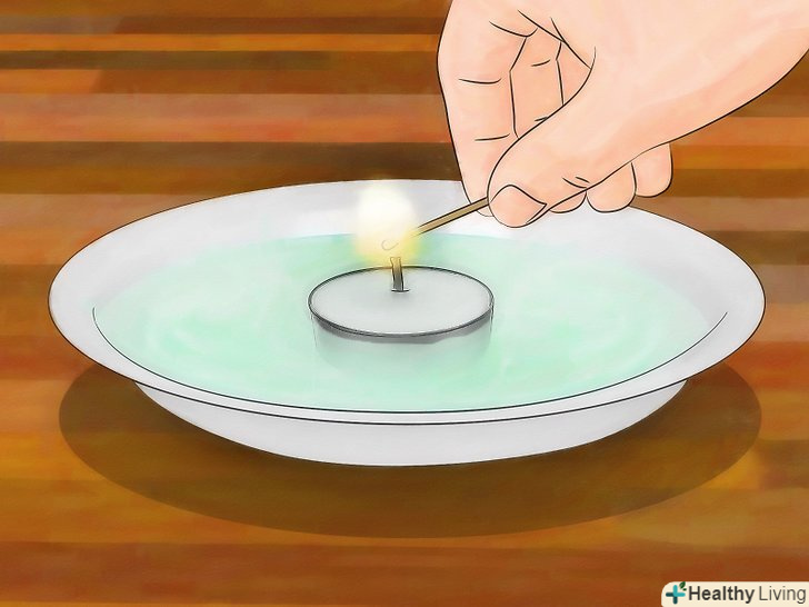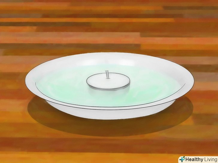 Потім візьміть одну маленьку чайну свічку і помістіть її в центр тарілки. Отже, у нас є кілька тарілок, наповнених водою і рідиною для миття посуду, і з чайною свічкою посередині.