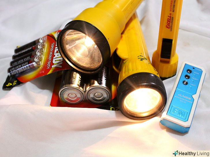 Покладіть в набір ліхтарики і радіо. вибирайте ліхтарик і радіо на сонячних батарейках. Також покладіть в набір світяться палички. Ніколи не кладіть свічки.