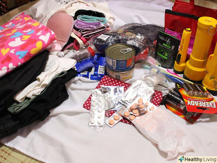 - Предмети першої необхідності, які слід покласти в набір: додатковий одяг, бинти, ліки, Туалетний папір, Готівка, консерви, продукти, що не псуються, напої в порошках, ксерокопії паспорта, туалетні приналежності, хлор для очищення води, батарейки та інші предмети, які здаються вам необхідними. Вам буде важко, якщо чогось раптом не опиниться під рукою.