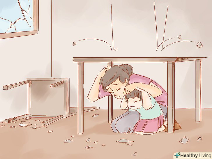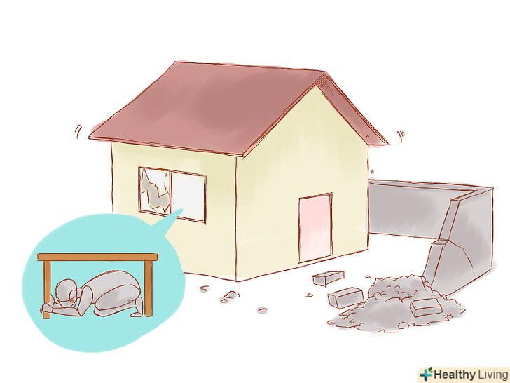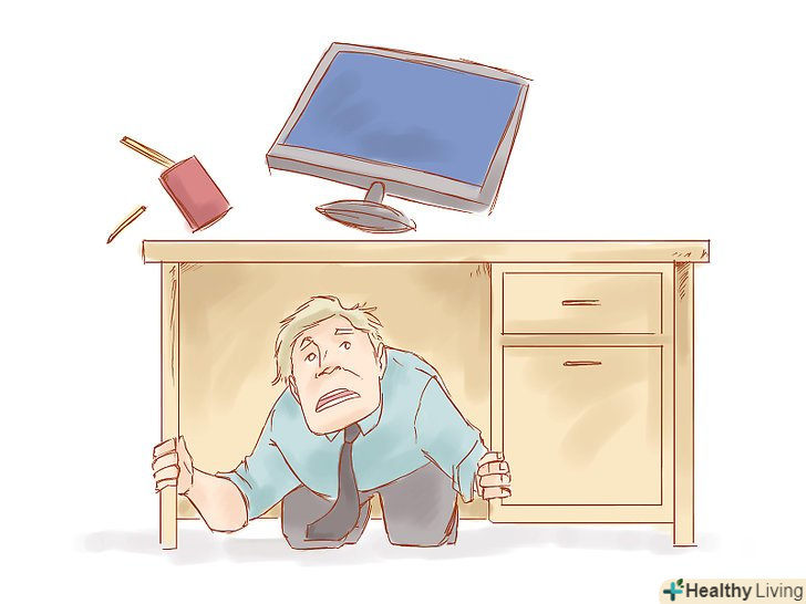 Знайдіть собі притулок. сховайтеся під міцним столом або іншим предметом меблів. По можливості тримайтеся подалі від скла, вікон, зовнішніх дверей, стін і всього, що може впасти, як наприклад, освітлювальні прилади або меблі. Якщо поруч з вами немає столу, прикривши обличчя і голову руками, присядьте, притулившись до внутрішнього кута будівлі.- Ніколи не: