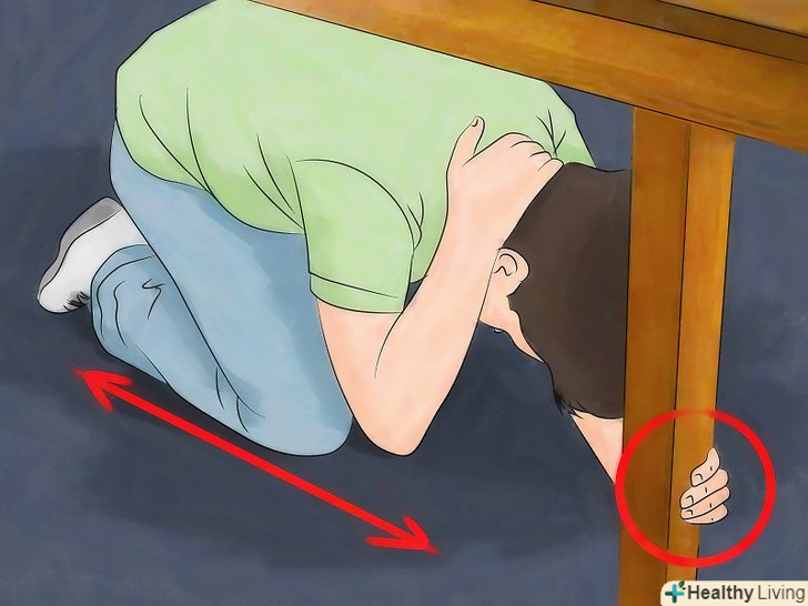 Тренуйтеся падати на підлогу, ховатися і триматися до тих пір, поки ці дії не стануть автоматичними. в умовах землетрусу це єдиний спосіб захистити себе. Опускайтеся на підлогу, ховайтеся під стійкий стіл і міцно тримайтеся. Будьте готові до того, що предмети будуть хитатися і падати. Потренуйтеся робити це в кожному приміщенні, щоб знати, де найбезпечніші місця. [4]- Якщо ви на вулиці, перемістіться на відкритий простір подалі від конструкцій, які можуть впасти або обрушитися (наприклад, будівлі, освітлювальні щогли). Опустіться на землю і закрийте голову від падаючих предметів. Залишайтеся там, поки землетрус не закінчиться. [5]