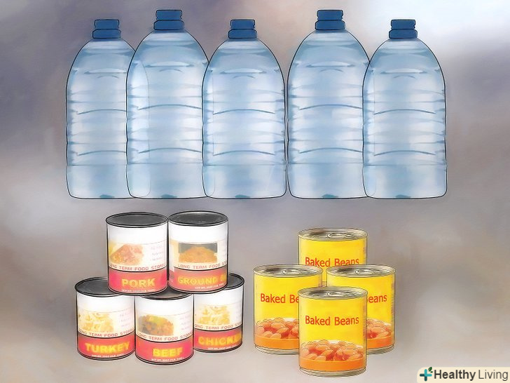 Купіть запас їжі і води як мінімум на три дні. у вас повинно бути не менше 4 літрів води на кожну людину і ще кілька літрів — на крайній випадок. Покладіть в набір ручну відкривачку для консервів. Можна купити будь-яку нешвидкісну їжу:- Консерви (фрукти, овочі, квасоля, тунець);