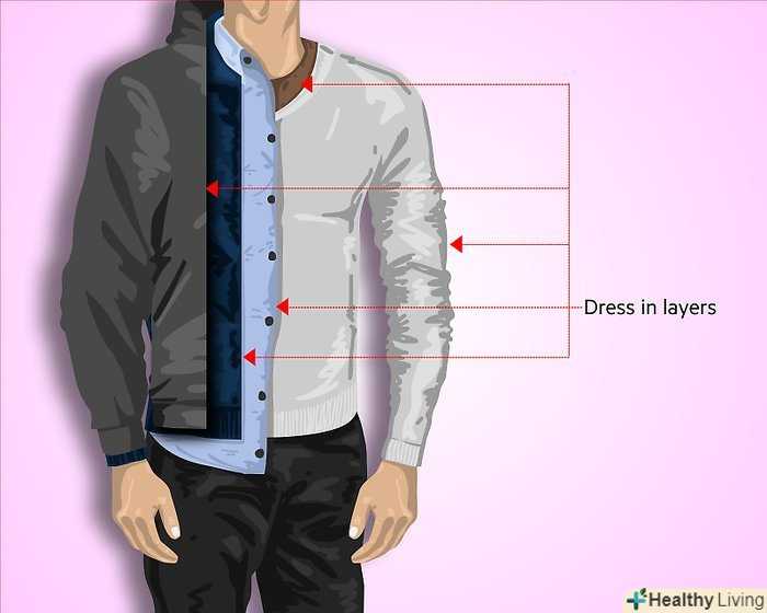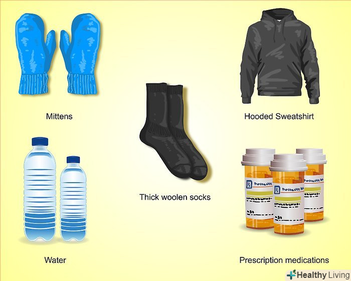- Одягайте одяг шарами. Одягніть шар бавовняного одягу, яка буде щільно прилягати до тіла, а потім покрийте тіло якомога більшою кількістю одягу (відмінно підійде старомодне довге нижню білизну). Дамам слід надіти колготи. Поверх всього слід надіти якомога більше шарів одягу, необхідних вам, щоб зігрітися. Завершіть образ парою вовняних шкарпеток і теплою кофтою з капюшоном.