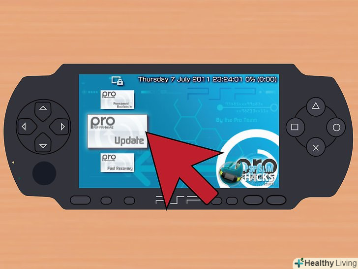 Встановіть скопійовану прошивку. прокрутіть меню "Game", знайдіть іконку "PRO Update" і виберіть цей пункт, натиснувши кнопку "Х". Екран стане чорним, на ньому з'явиться невелике меню. Натисніть " Х " для того, щоб встановити прошивку. Через короткий час ви отримаєте повідомлення про те, що установка завершена. Знову натисніть "Х", щоб запустити роботу прошивки.