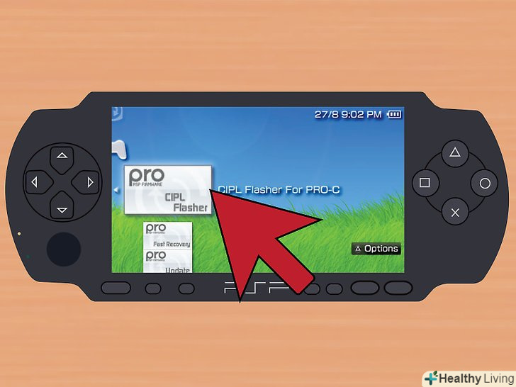 Внесіть зміни в IPL. на PSP моделей 1ххх і 2ххх вам, крім усього іншого, треба буде запустити т.зв. "CIPL Flasher", який також можна знайти в меню "Game". Це внесе зміни в IPL (Initial Program Loader), спеціальний програмний модуль, який змінить налаштування системи так, щоб при включенні завантажувалася саме стороння прошивка.