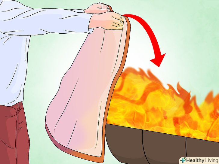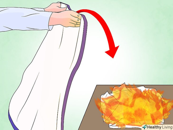 Використовуйте пожежне покривало, щоб загасити вогонь. Якщо джерелом вогню є тверді горючі матеріали (деревина, тканина, папір, гума, пластик і так далі), то пожежа відноситься до класу А. Пожежне покривало дозволить швидко і легко загасити початкову стадію пожежі класу А Воно перекриє доступ кисню до вогнища спалаху, який підживлює процес горіння.- Щоб скористатися пожежним покривалом, вийміть його з упаковки, розгорніть і візьміть перед собою таким чином, щоб воно захищало ваші руки і тіло, після чого накрийте їм невелике полум'я. НЕ кидайте покривало на вогонь.
