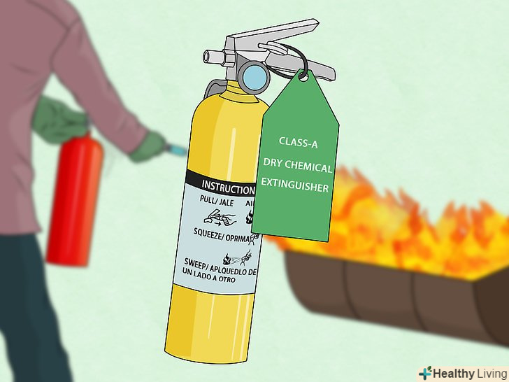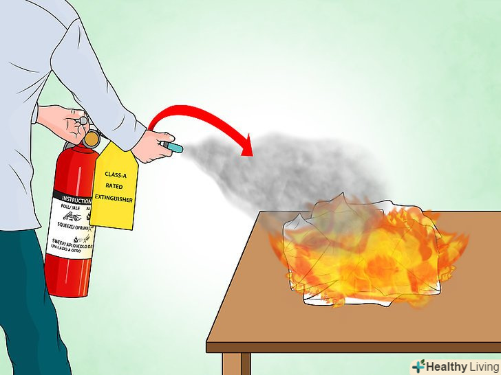 Скористайтеся вогнегасником класу а, щоб загасити вогонь. Якщо у вас немає під рукою пожежного покривала, то можна використовувати вогнегасник, щоб загасити пожежу класу А. переконайтеся в тому, що на балоні вогнегасника вказано клас А.- Щоб скористатися вогнегасником, направте потік речовини з сопла вогнегасника в основу вогню і перемішайте струмінь, туди-назад, поки не загасіть загоряння. [22]