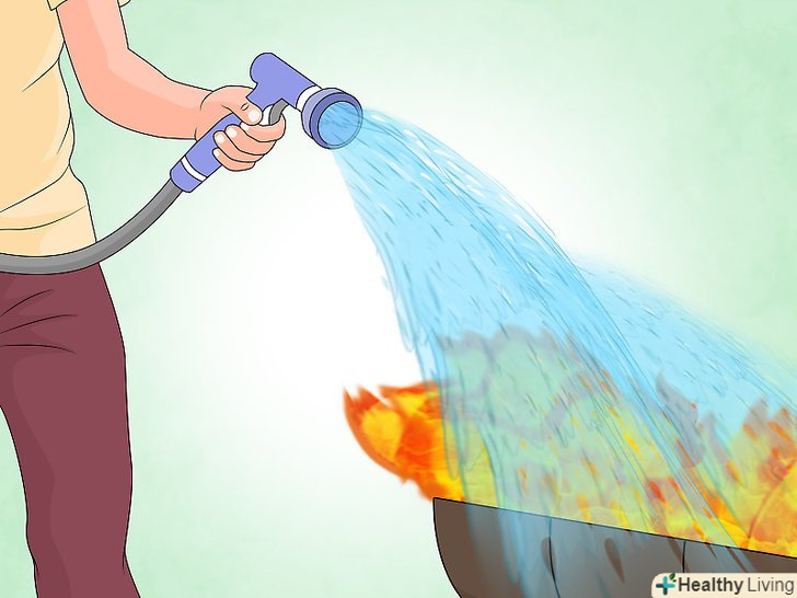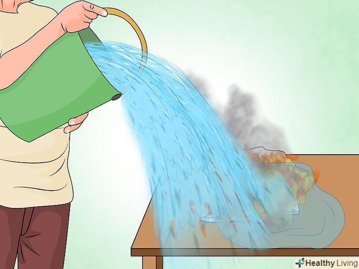Тушкуйте вогонь водою. якщо у вас під рукою немає ніяких вогнегасників або пожежних покривал, можна скористатися водою. Однак, використовуйте воду тільки в тому випадку, якщо ви на 100% впевнені в тому, що повністю відключили електроживлення. В іншому випадку ви ризикуєте не тільки отримати удар струмом, але і викликати швидке поширення пожежі через електричних розрядів. Водою слід залити підставу полум'я (вогнище загоряння).- Той потік води, який можна отримати з водопровідного крана, буде ефективний для гасіння тільки маленьких загорянь на обмеженому просторі. В іншому випадку вогонь встигне поширитися до того, як ви його заллєте.