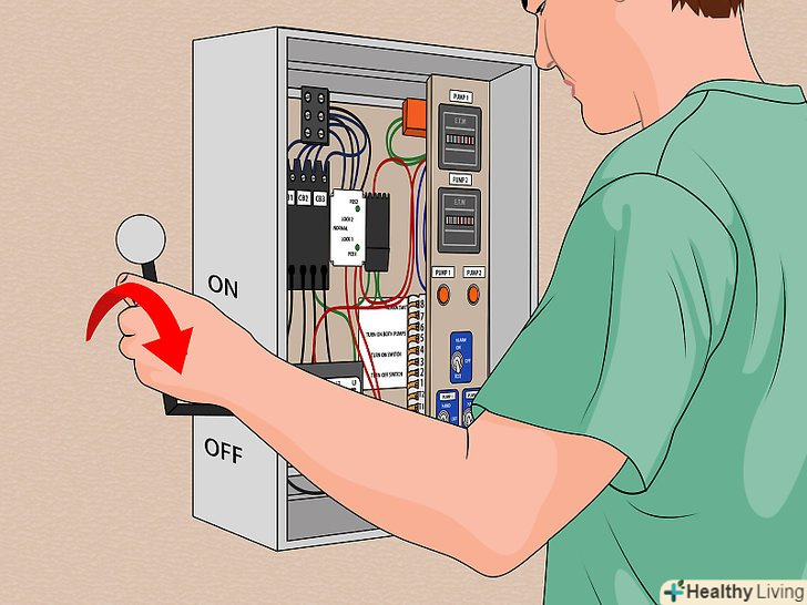 Повністю вимкніть електрику. Якщо в електромережі виникли іскри, запалилися дроти, обладнання або розетки, то першим і найкращим кроком буде повне відключення електрики. [4] якщо в електромережі поки виникли тільки іскри, але не сталося загоряння, даного кроку повинно бути достатньо, щоб попередити пожежу.- Подачу електрики необхідно відключити в електрощиті, а не на вимикачі проблемної розетки. [5]