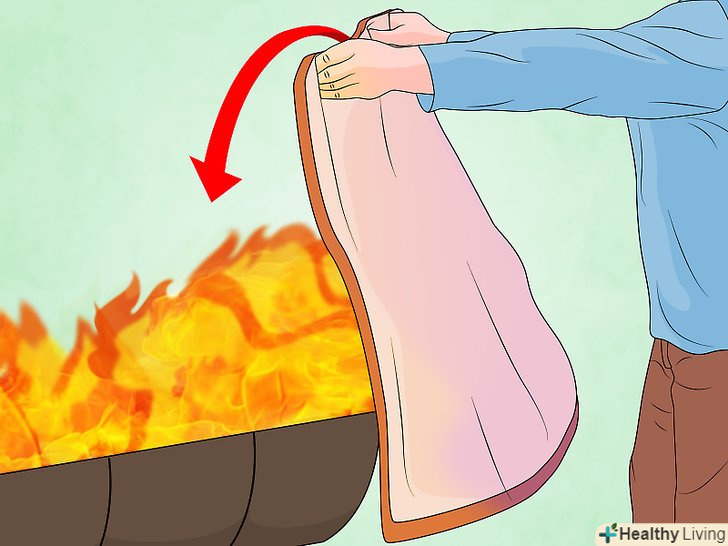 Скористайтеся пожежним покривалом, щоб загасити вогонь. Пожежне покривало можна також використовувати для гасіння невеликих загорянь класу B. Якщо пожежне покривало знаходиться під рукою, то загасити їм таке загоряння з мінімальним збитком буде найпростіше.- Щоб скористатися пожежним покривалом, вийміть його з упаковки, розгорніть і візьміть перед собою таким чином, щоб воно захищало ваші руки і тіло, після чого накрийте їм невелике полум'я. НЕ кидайте покривало у вогонь.