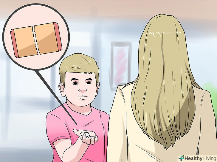 Використовуйте квиток без корінця.якщо старший друг або родич погодилися купити квиток, але кінотеатр не пропускає на сеанси дітей у супроводі дорослих, то попросіть друга або брата купити квиток для себе. Скажіть йому зайти в зал, щоб контролер відірвав корінець квитка. Домовтеся, щоб через кілька хвилин друг вийшов із залу, знайшов вас і передав квиток без корінця, який можна показати контролеру і "повторно зайти" в зал, ніби ви недавно вийшли із залу у справах.[12]- Заздалегідь придивіться до контролера. Зверніть увагу, наскільки він розглядає квитки або просто пропускає відвідувачів і не вдивляється. Якщо досить просто показати квиток в руках, то можна навіть використовувати квиток з попереднього сеансу.[13]